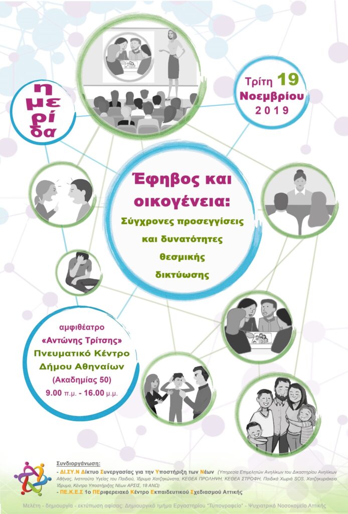 Το Δίκτυο Συνεργασίας για την Υποστήριξη Νέων (ΔΙ.ΣΥ.Ν), σε συνεργασία με το 1ο ΚΕΠΕΣ διοργανώνουν την ημερίδα με τίτλο: ” Έφηβος και οικογένεια: Σύγχρονες προσεγγίσεις και δυνατότητες θεσμικής δικτύωσης”, η οποία θα πραγματοποιηθεί στις 19-11-2019, στην αίθουσα ΤΡΙΤΣΗ, στο Πνευματικό Κέντρο του Δήμου Αθηναίων και ώρα 9.00 πμ.-16.00 μ.μ.