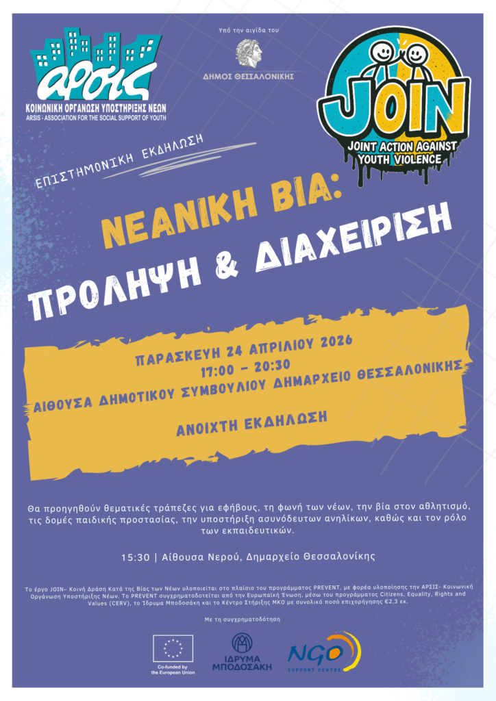 Η εκδήλωση διεξάγεται στο πλαίσιο του έργου «JOIN– Κοινή Δράση Κατά της Βίας των Νέων» και στοχεύει στην ανάδειξη καλών πρακτικών, στην ανταλλαγή εμπειριών και στη διαμόρφωση ουσιαστικού διαλόγου γύρω από την πρόληψη και τη διαχείριση της νεανικής βίας.