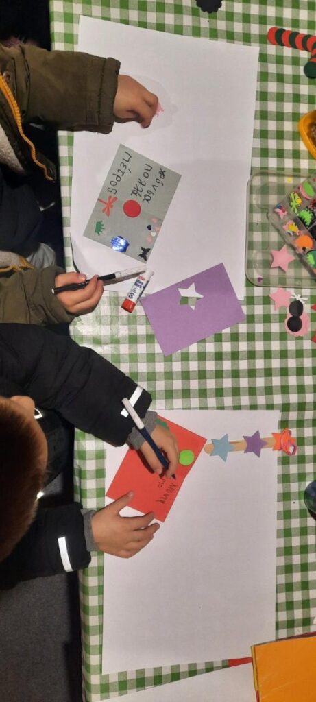 Στήσαμε ένα δημιουργικό εργαστήρι κατασκευής χριστουγεννιάτικων στολιδιών και καρτών, όπου παιδιά και γονείς δημιούργησαν μαζί, πειραματίστηκαν με υλικά και χρώματα, εξέφρασαν τη φαντασία τους και έφυγαν με τις δικές τους χειροποίητες δημιουργίες — μικρά δώρα γεμάτα ζεστασιά και συναίσθημα.