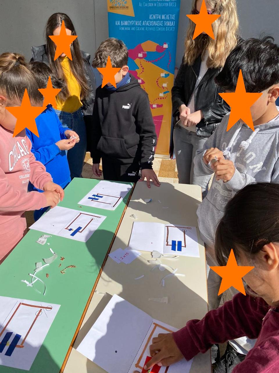 Βρεθήκαμε στο υπέροχο αίθριο του Δ.Σ. του Λακκίου, όπου γνωριστήκαμε, μιλήσαμε το ένα τη γλώσσα του άλλου, χωριστήκαμε παίζοντας σε ομάδες και πραγματοποιήσαμε πειράματα για τον ηλεκτρισμό και το μαγνητισμό, βοηθώντας και συζητώντας μεταξύ μας. Κατά τη διάρκεια των εργαστηρίων: