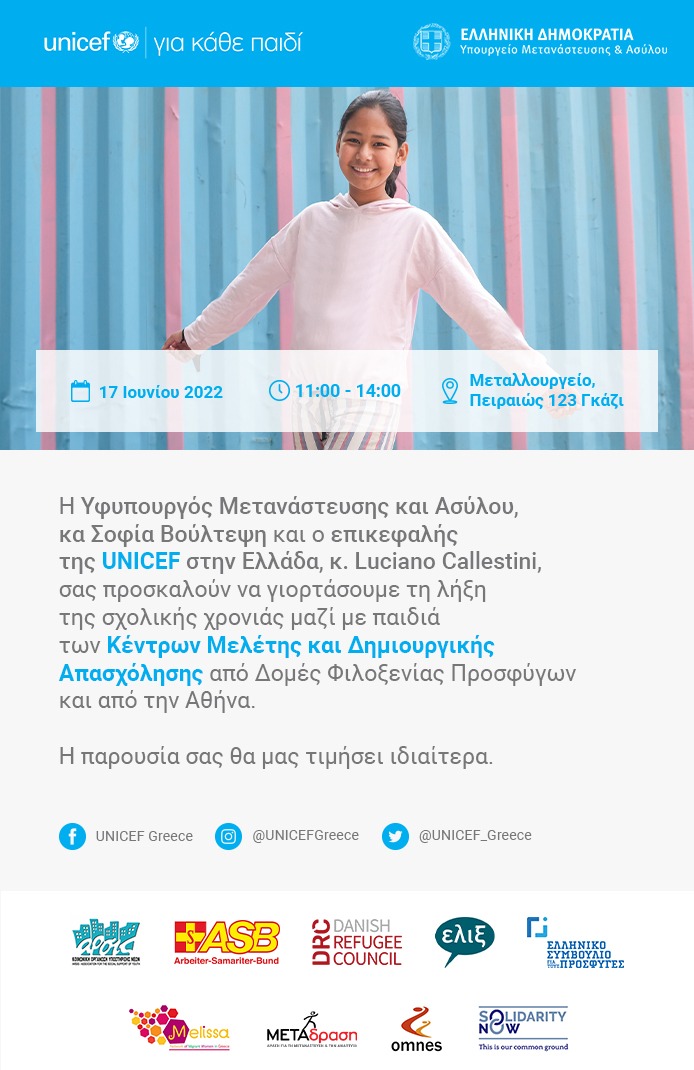 Η ΑΡΣΙΣ-Κοινωνική Οργάνωση Υποστήριξης Νέων με μεγάλη χαρά συμμετέχει στην εκδήλωση λήξης του σχολικού έτους 2021-2022 στο πλαίσιο του πρώτου χρόνου υλοποίησης του προγράμματος ”All Children in Education” που διοργανώνει η UNICEF Greece σε συνεργασία με το Υπουργείο Μετανάστευσης & Ασύλου.